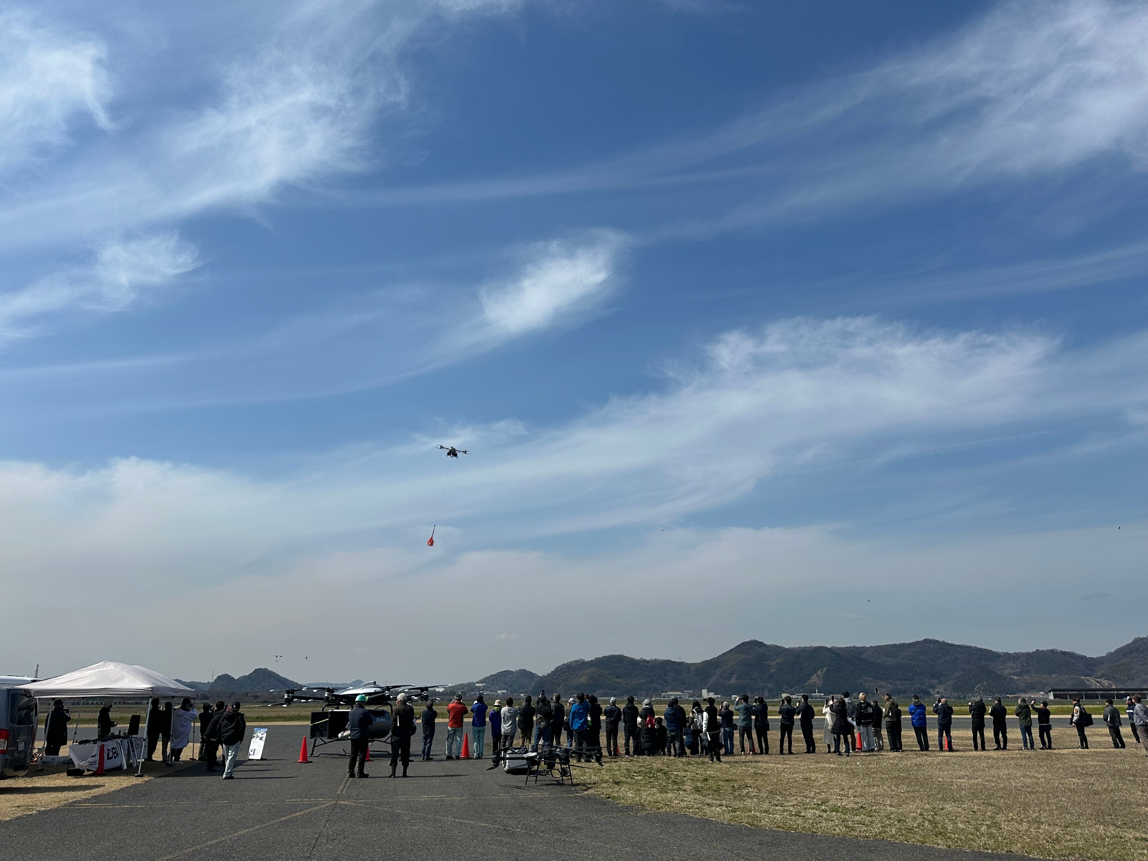 東日本大震災から15年の節目となるこの日に、物流用「空飛ぶクルマ」EHang社製「EH216L」(最大250kg積載・現在日本国内に1台のみ存在)と、DJI社製最新物流ドローン「FlyCart 100」(最大80kg積載)という、現在の日本でこの組み合わせを実現できる唯一のチームによる開催が実現。岡山県内外から行政・ドローン事業者・企業・個人など50名以上が参加し、次世代の物流インフラを体感する機会となりました。