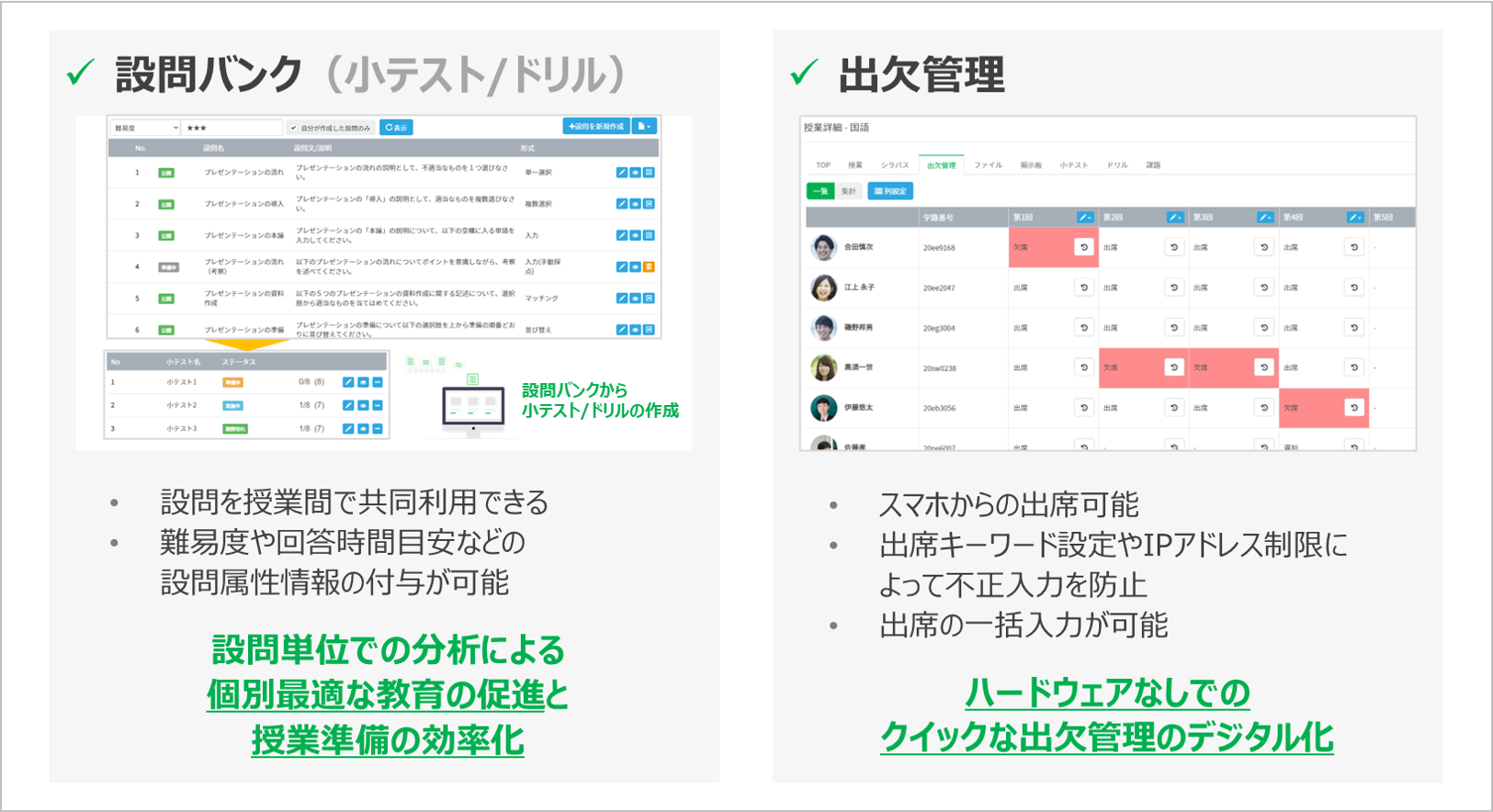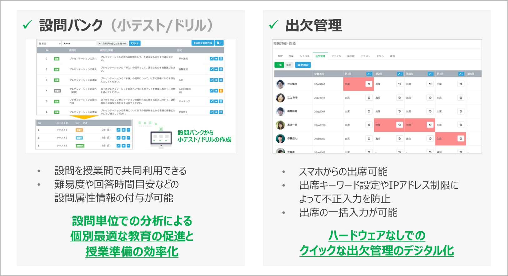 その中でも小テストとドリルに搭載されている「設問バンク」機能と「出欠管理」機能について紹介します。