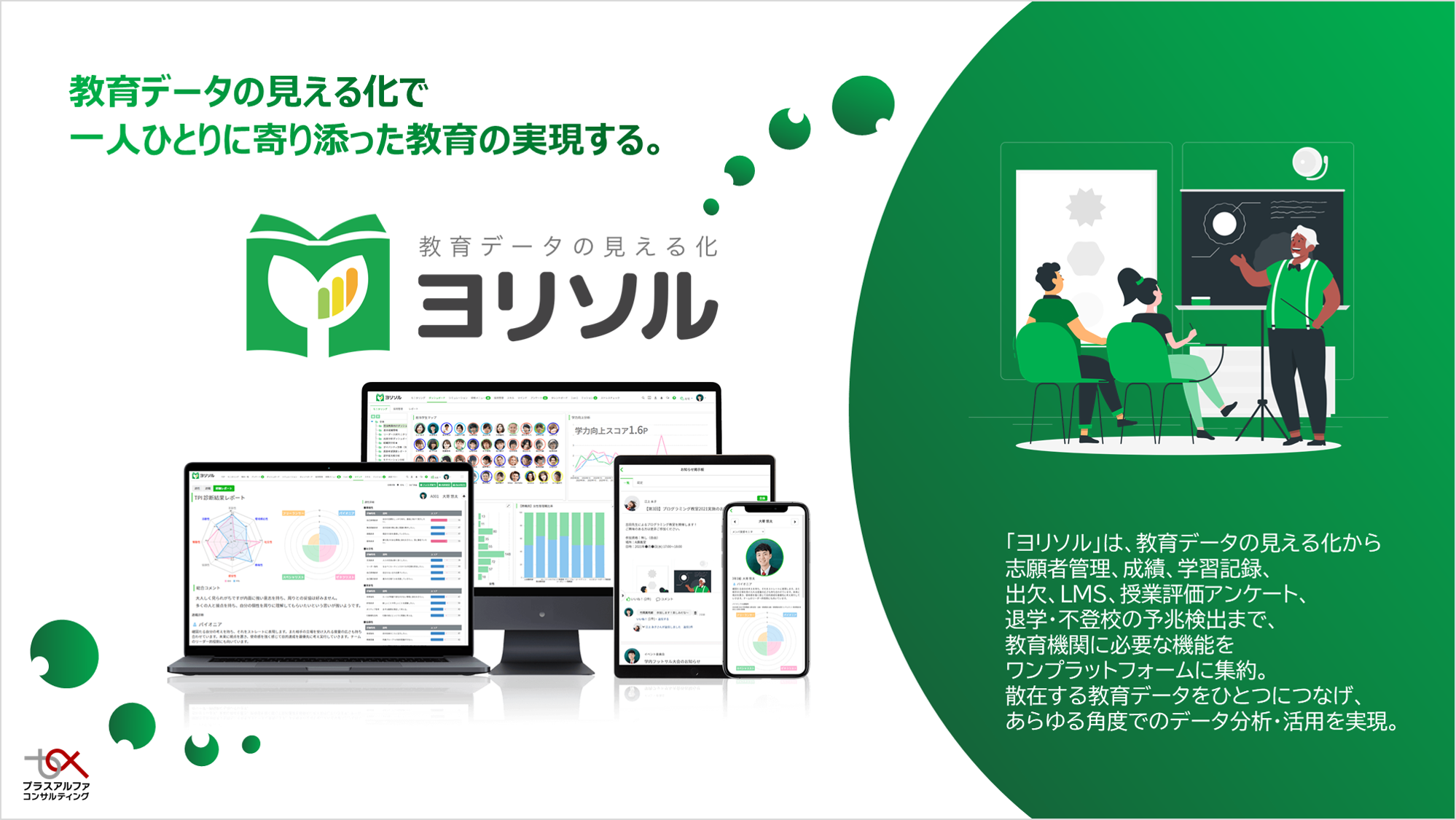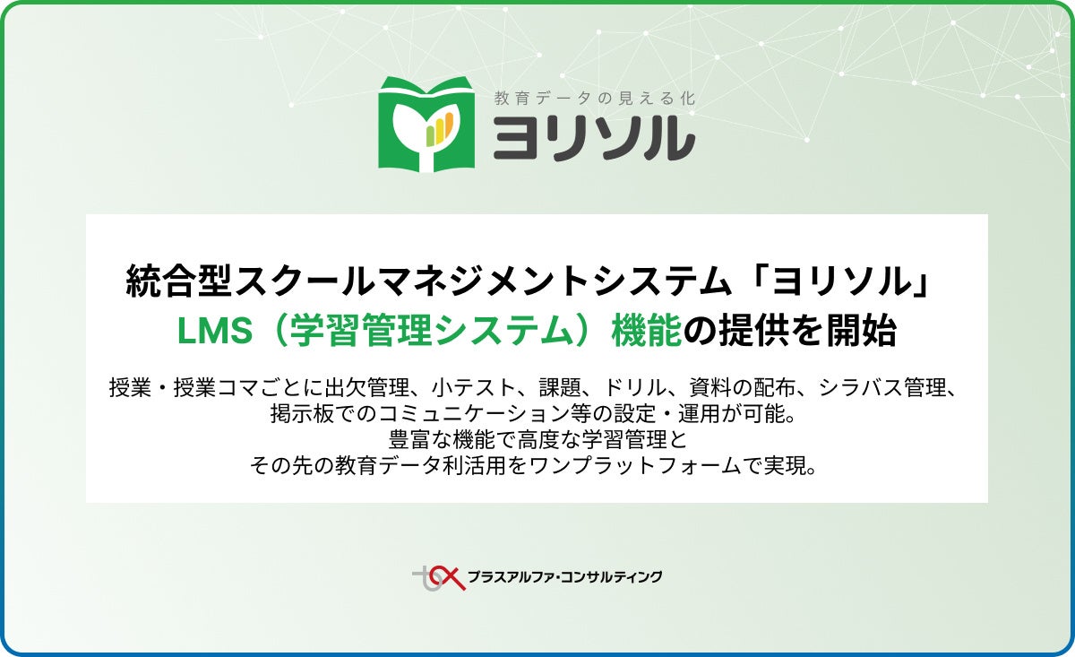 株式会社プラスアルファ・コンサルティング(本社:東京都港区、代表取締役社長:三室 克哉、 証券コード:4071)は、教職員の負担軽減と本質的な教育データ利活用・教育DXの実現をご支援すべく、「ヨリソル」にLMS(学習管理システム)機能の提供を開始することをお知らせいたします。