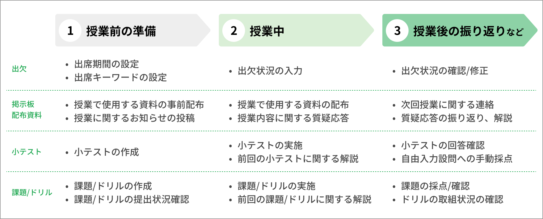 この対象者設定を基本とし、担当教職員は、授業や講義・コースの中で、更にコマ単位での、出欠管理、小テスト、課題、ドリル、資料の配布、シラバス管理、掲示板でのお知らせやコミュニケーション等の設定・運用が可能です。