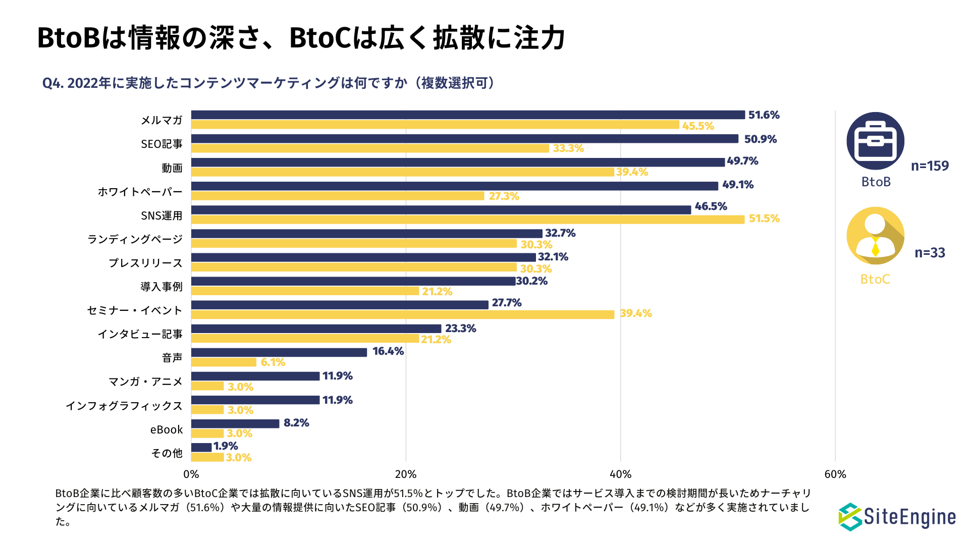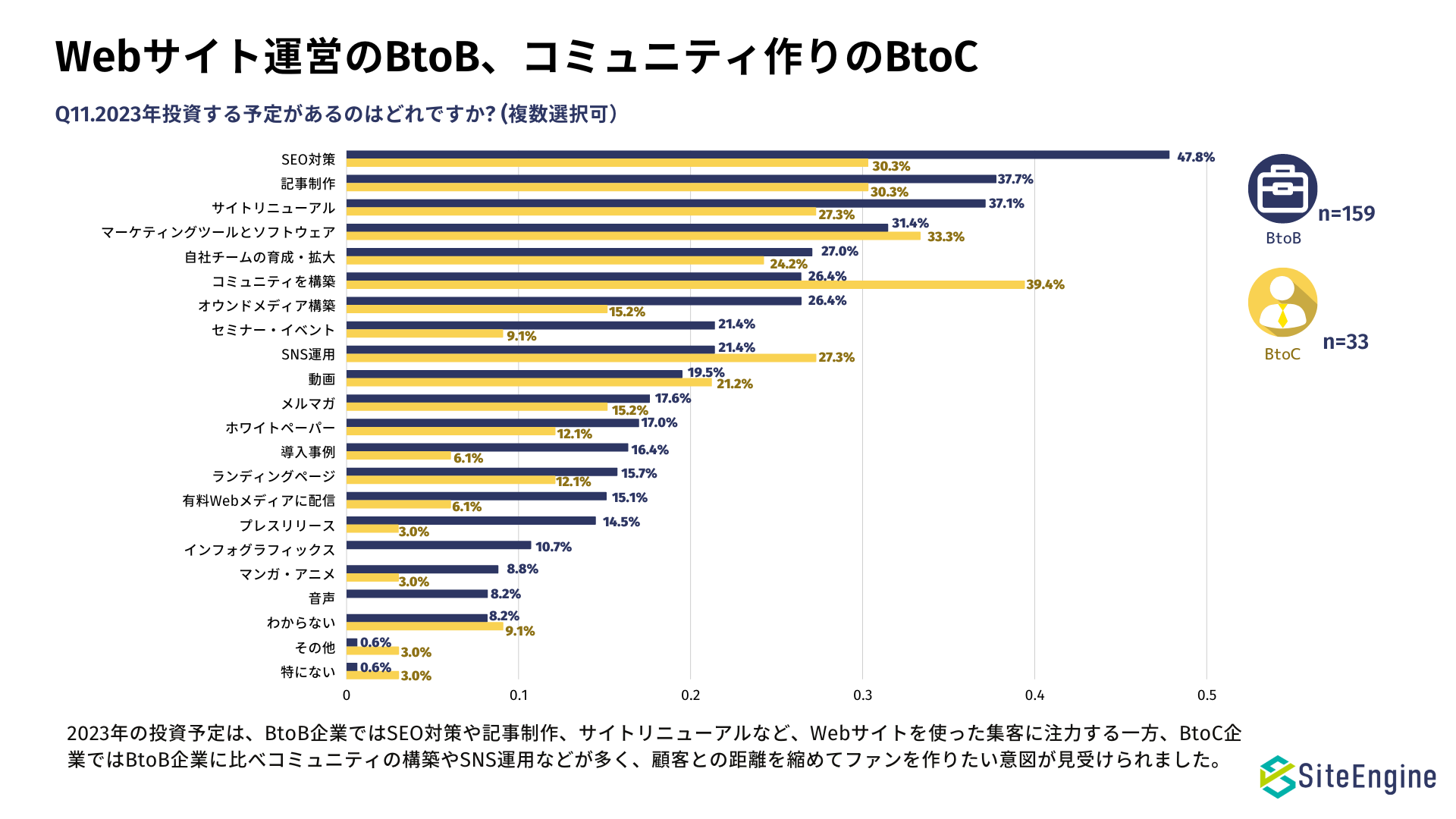 ・BtoB企業はWebサイト運営に注力し、BtoC企業は顧客とのコミュニケーションに注力している