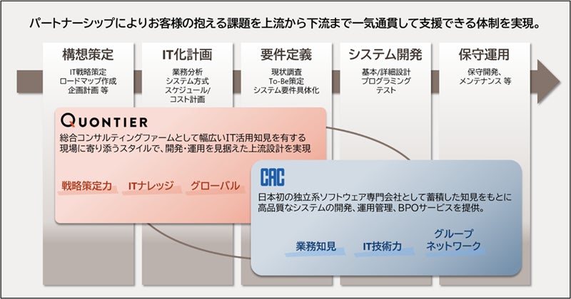 本提携により、CACのIT技術力、業務知識、グループネットワークに基づいた高品質なシステム開発に、クオンティアのコンサルティングリソースとノウハウとを組み合わせることで、経営戦略策定からシステム実装までを一気通貫で支援し、顧客の抱える課題を両社が包括的に解決できる体制を構築します。