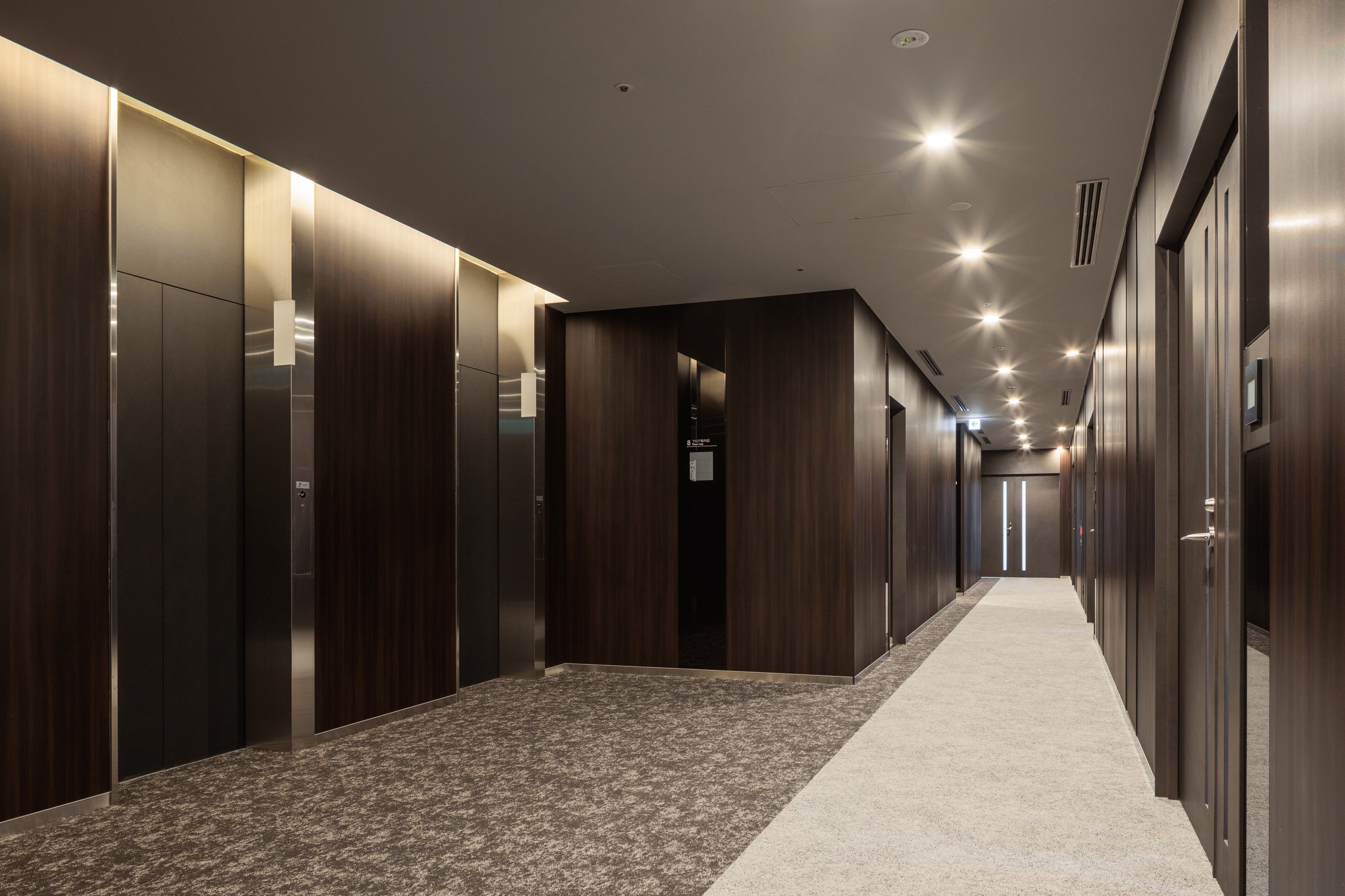 九州ゆかりの樹種を取り入れた「グリーンラウンジ」では、タッチダウンスペースを備えており、待ち時間でちょっとした作業が可能です。また、癒し音楽や四季ごとに変わるアロマの香り、生きた植物で過ごす人の「五感」に心地よく働きかけます。壁面にはマットな質感の仕上げを採用し、間接照明と組み合わせることで、落ち着きと上質感を演出しています。