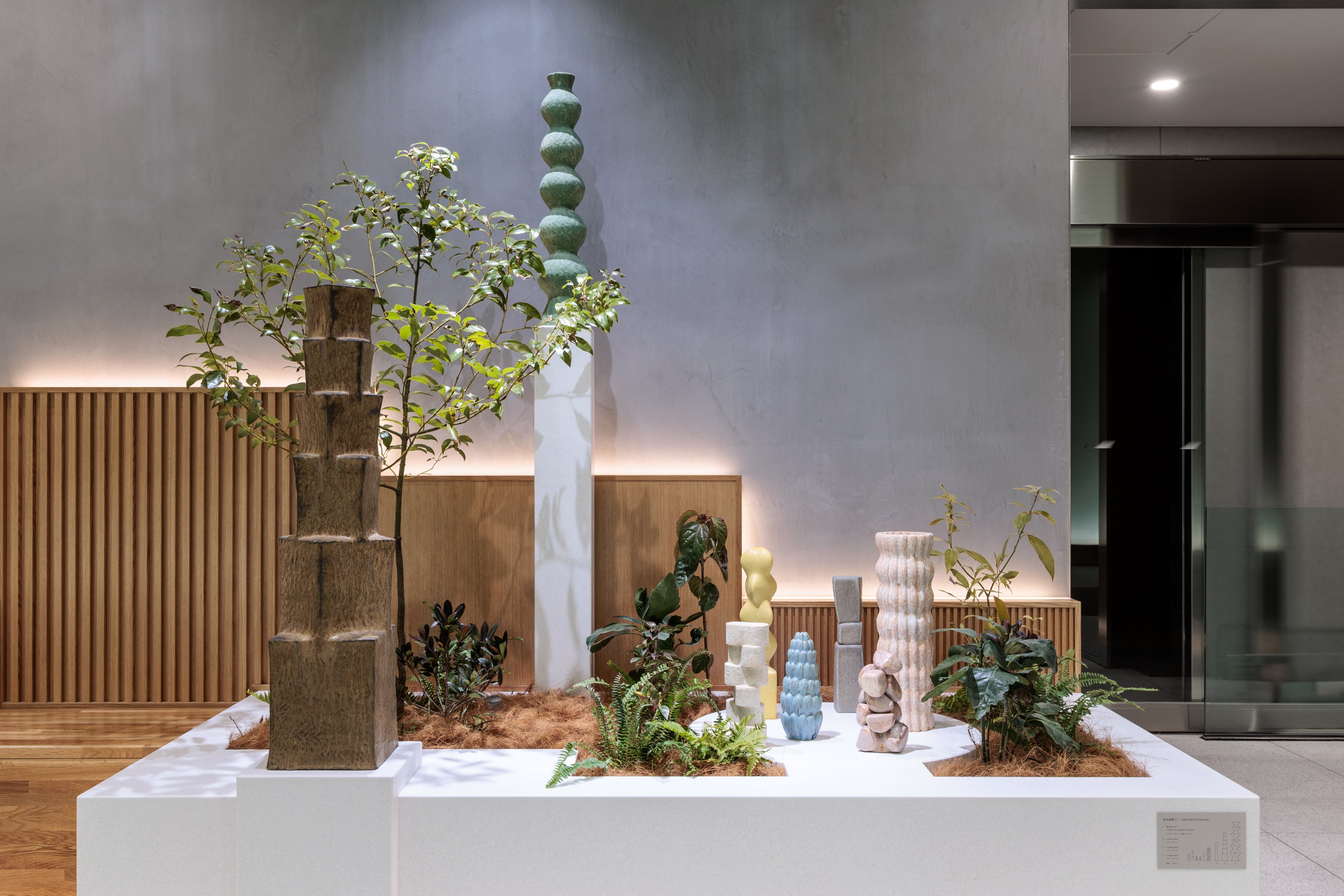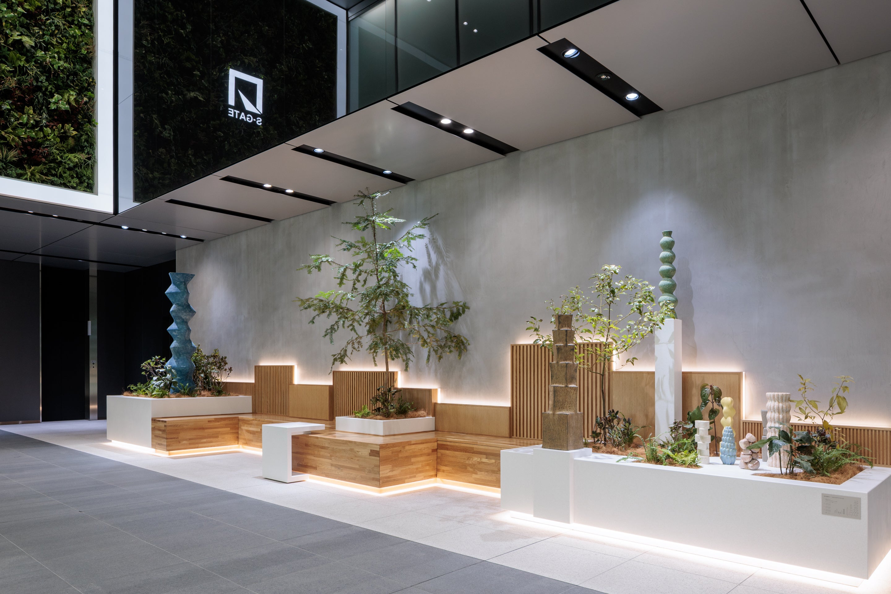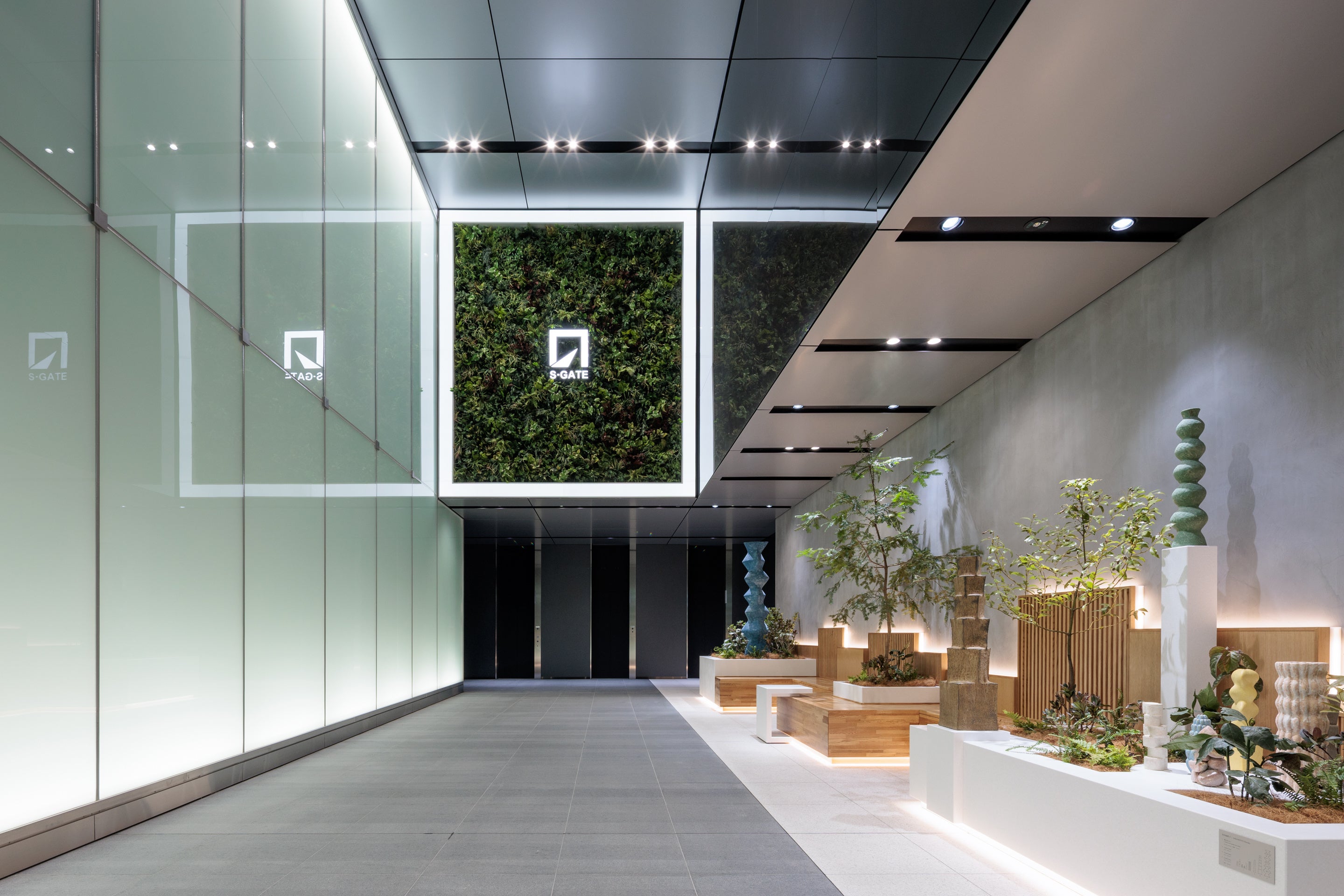 植栽の中にアートがあることで、見る人の目を癒し、想像力に心地よく働きかけます。建築や環境の中にアートを導入することを使命とし、国内外で活躍するキュレーターの「㈱コダマシーン」協力のもと、坂本氏の作品の制作・導入に至りました。坂本氏が手掛ける作品は、植物のように凛々しく立ち上がっていくさまが特徴で、「入居する人が、企業が、走り続け進化していく」というS-GATEのコンセプトに合致しています。地元九州西部の光と植生を想起させるアートが、入居する企業や利用される方の表情を表し、それぞれが伸び伸びとウェルビーイングを謳歌しているようなエントランス空間を演出しています。