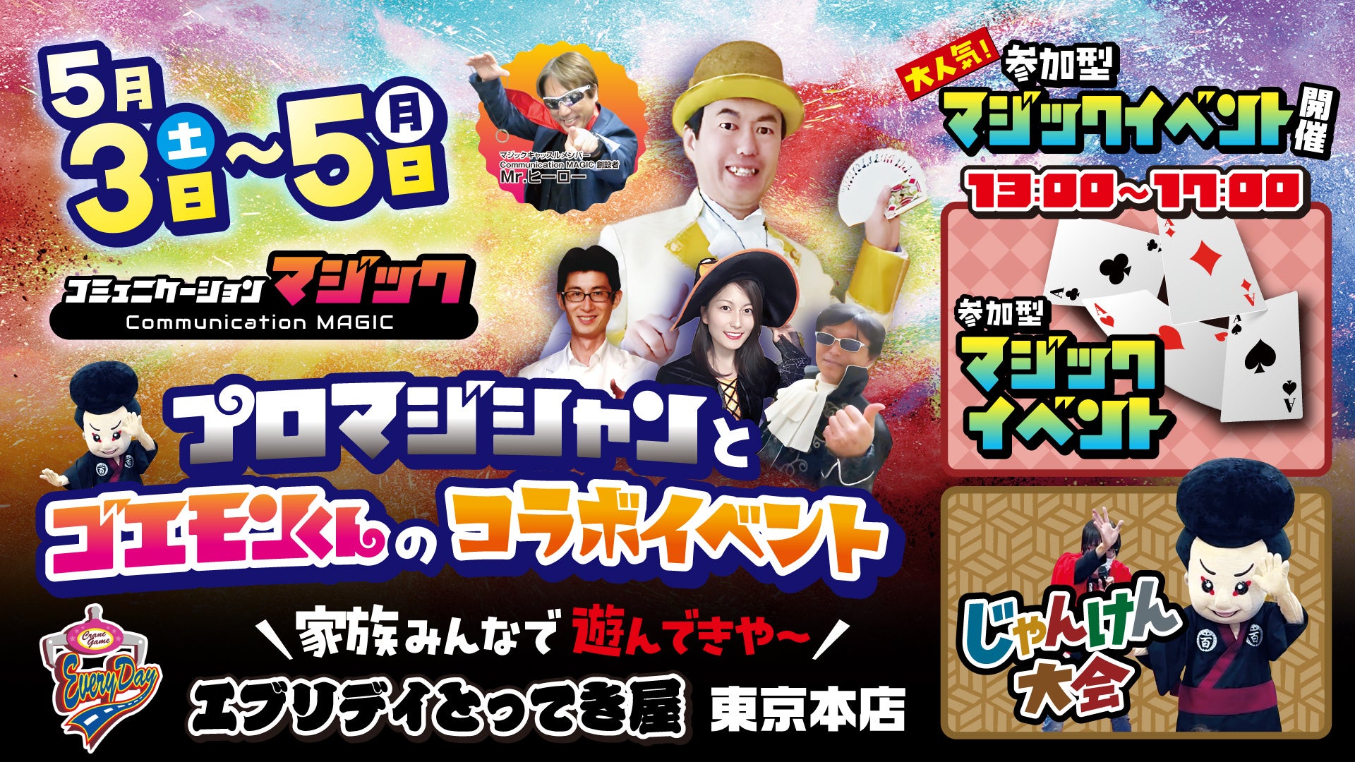 「笑顔創造」を企業理念とする株式会社東洋(代表取締役:中村秀夫/本社:埼玉県北本市、以下 当社)が運営するクレーンゲームのテーマパーク【エブリデイ とってき屋東京本店】(所在地:埼玉県八潮市)にて、ゴールデンウィーク(以下、GW)期間中、お客様参加型のスペシャルイベント「コミュニケーション・マジック」を開催することが決定いたしました。今回は、お子様に大人気の弊社オリジナルキャラクター「ゴエモンくん」とのコラボレーションイベントとなります。