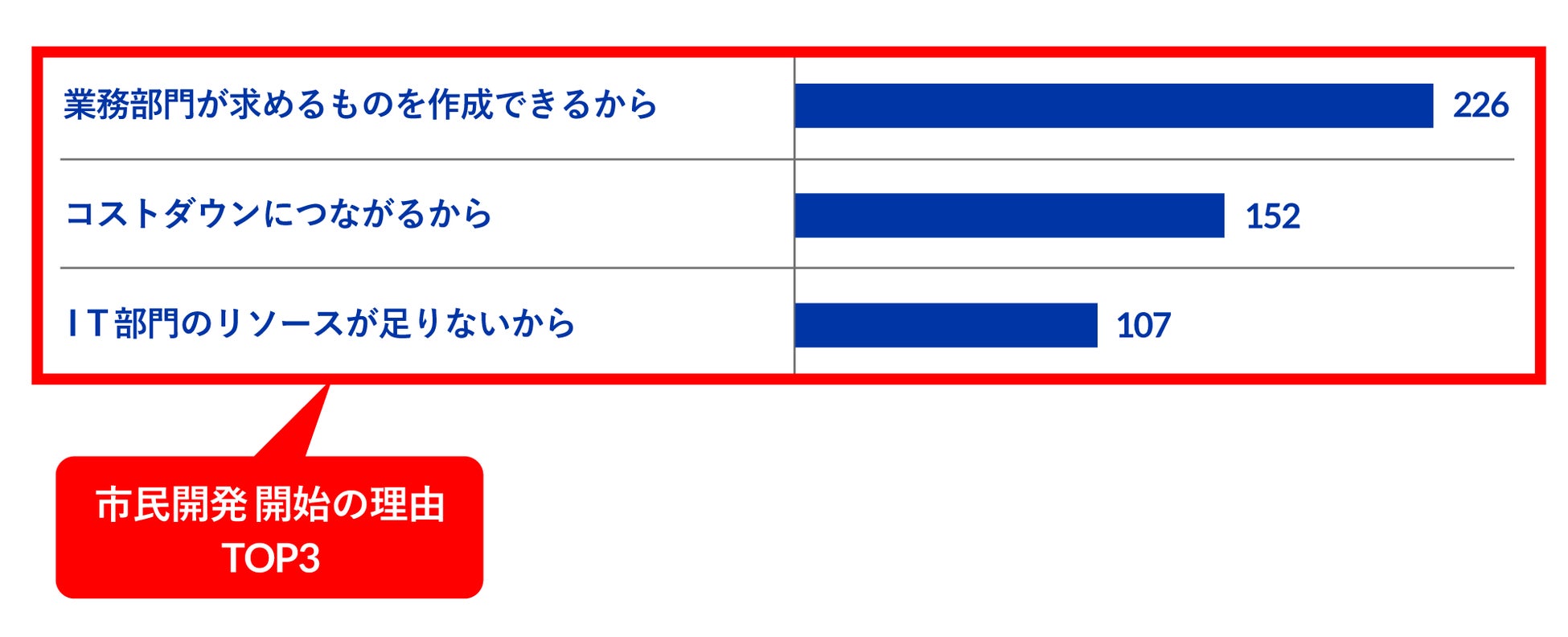 業務部門が自ら開発する「市民開発」を始めることになった理由については、1位が「業務部門が求めるものを作成できる」(226名)で、2位は「コストダウン」(152名)、3位は「IT部門のリソースが足りない」(107名)という結果になり、ポジティブな理由が半数を占めていることが明らかになりました(グラフ3)。