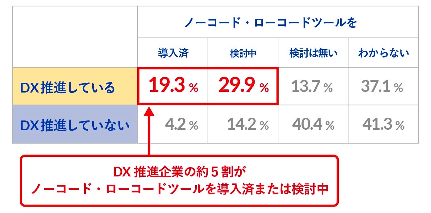 またDX推進企業の約5割(49.2%)がノーコード・ローコードツールを導入または検討中