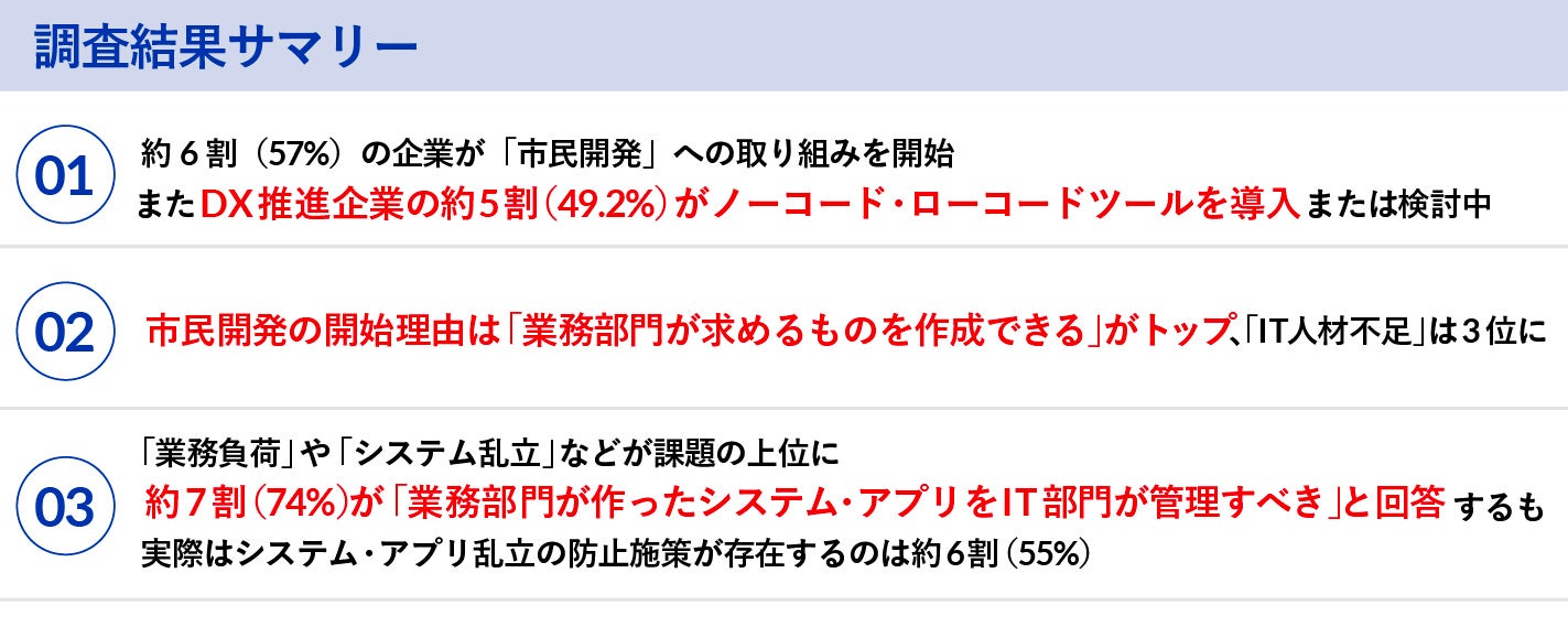 その結果、市民開発を推進している企業は約6割(57%)にのぼったほか、デジタルトランスフォーメーション(DX)を推進する企業の約5割(49.2%)がプログラムのソースコードを極力記述せずにシステムを開発できる「ノーコード・ローコード」ツールを導入または検討していることがわかりました。 一方で「システムが乱立、個別最適化されてしまう」などの課題も浮き彫りになりました。
