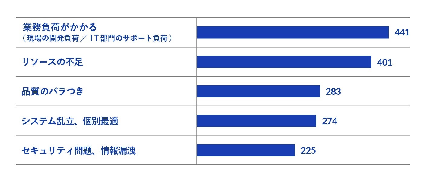 また、課題について聞いたところ、「業務負荷がかかる」「リソースの不足」と回答した人が上位になり(それぞれ441名、401名)、続いて「品質のバラつき」(283名)、「システムが乱立、個別最適化されてしまう」(274名)という結果になりました(グラフ4)。