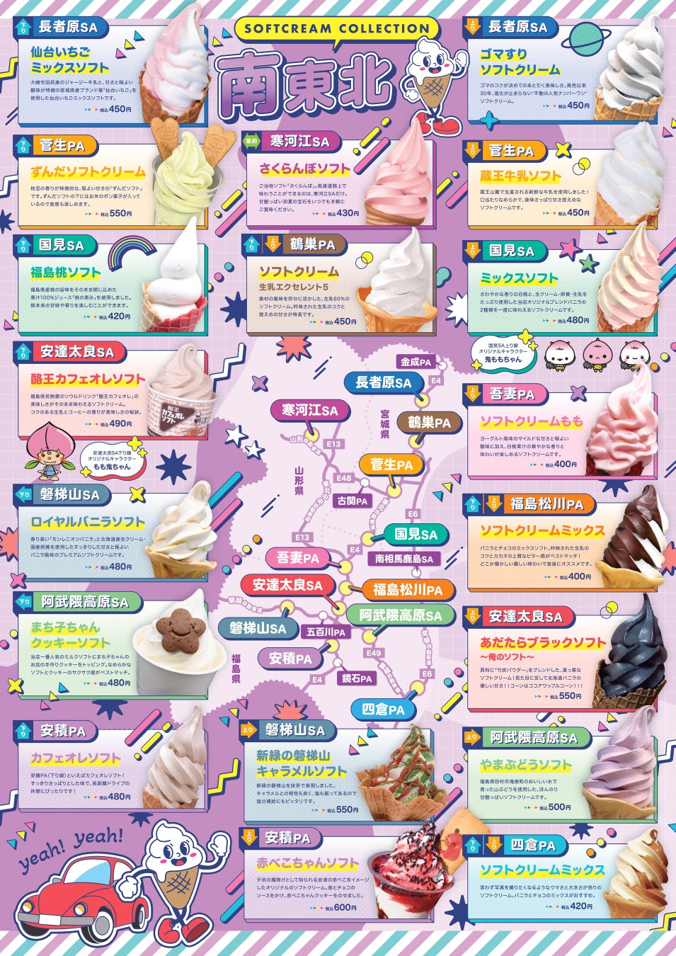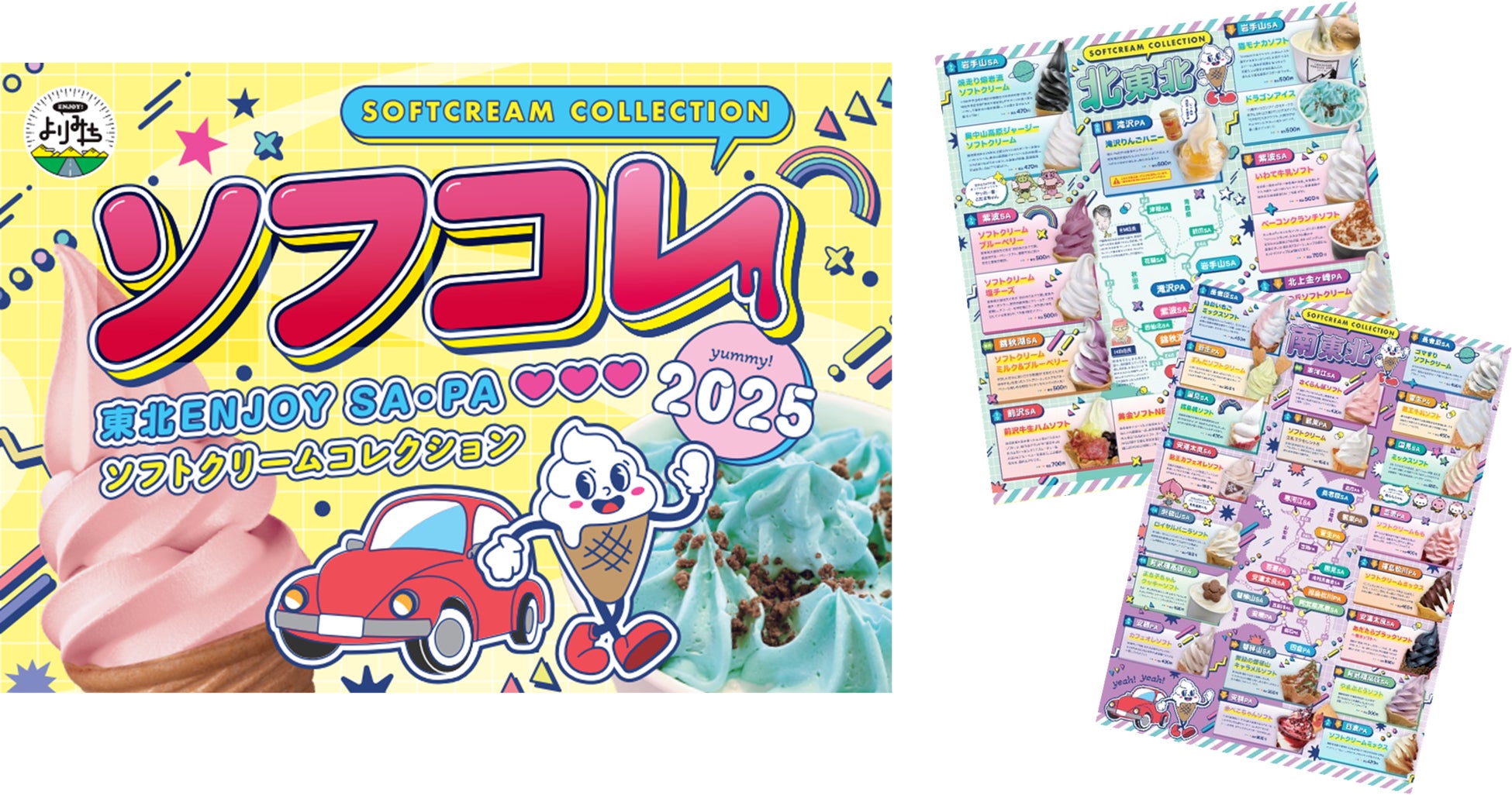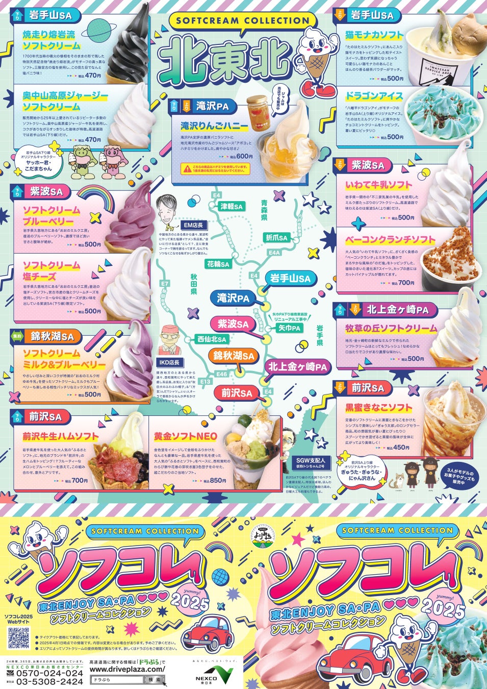 株式会社ネクスコ東日本エリアトラクト(東京都港区)では、東北地方のサービスエリア・パーキングエリア(以下、SA・PA)で販売されている個性豊かなソフトクリームをまとめて掲載したマップ「ソフトクリームコレクション2025」を、4月25日(金)から東北エリアのSA・PAにて配布開始します。