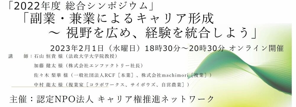 認定NPO法人キャリア権推進ネットワーク主催『副業・兼業によるキャリア形成 ~ 視野を広め、経験を統合しよう「キャリア権推進ネットワーク 2022年度 総合シンポジウム」』に代表の加藤が登壇します。