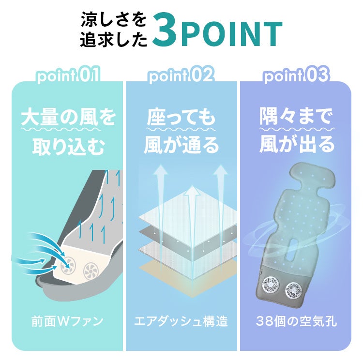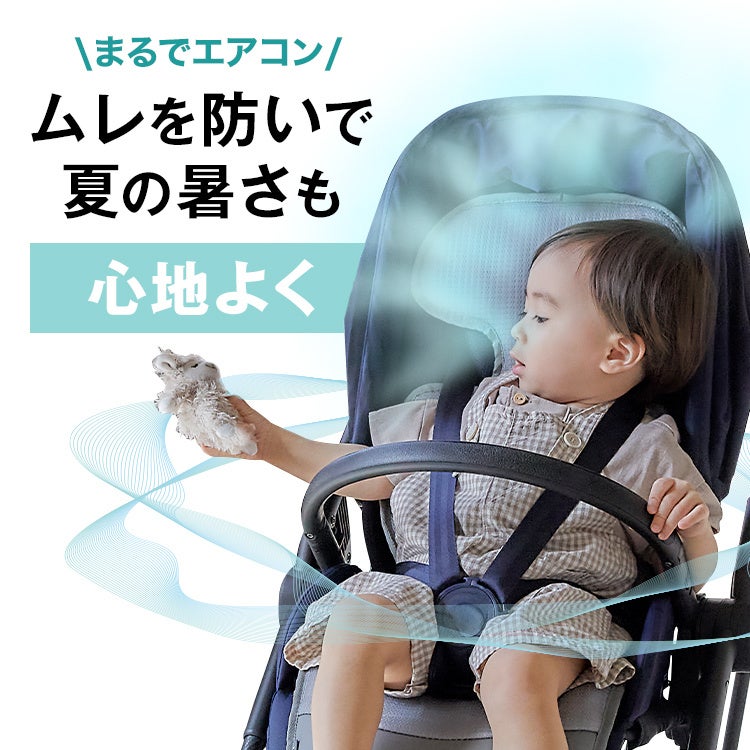 ベビーカーやチャイルドシートに簡単に取り付けることができるファン付きシートで、ファンから取り込んだ新鮮な空気をシート全体に送ることで、蒸し暑くなりがちなベビーカー内や、蒸れやすい赤ちゃんの背中を快適に保ちます。これ一つで暑さ対策が完結するので、パパやママも楽ちんです!
