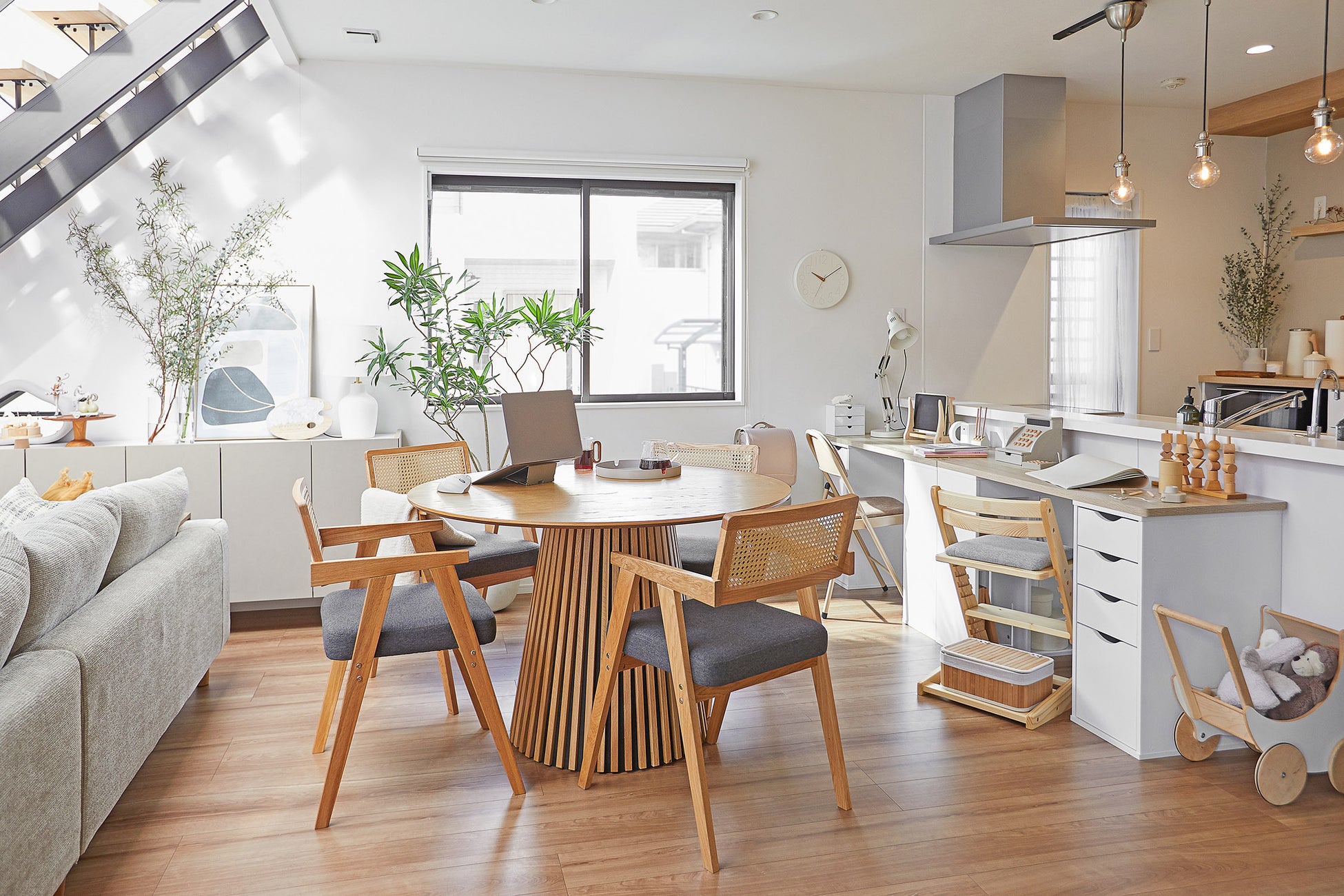 アイボリーのカラーリングソファをメインとした北欧×ナチュラルなMIXテイスト。ところどころにゴールドがアクセントの雑貨や照明を配置することでよりおしゃれな空間に。両空間にラウンドテーブルを使用することで部屋全体に統一感と柔らかさをプラス。また全体的に木製の家具を使用し温かみのあるリビングダイニング空間に仕上げています。また、ところどころに取り入れたゴールドがアクセントの照明や雑貨でワンランク上の小洒落た空間を演出しています。