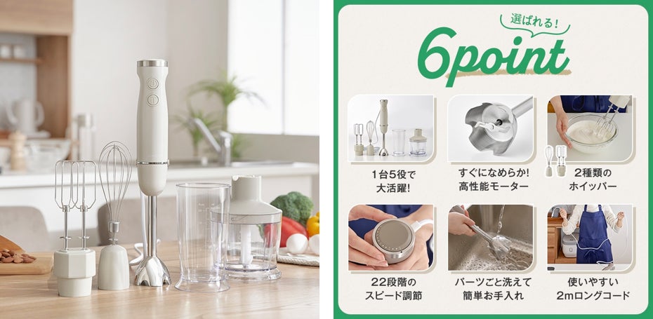1台5役のハンドブレンダーが新発売!「混ぜる」「つぶす」「刻む」「砕く」「泡立てる」がこれ1台で叶います。スピードは22段階と細やかに調節ができるので、普段の調理や離乳食作りなど、毎日の料理をサポートします。回転数と刃の形状を最適化し、1分間に13,500回転という高回転ですぐに食材をなめらかにすることができます。