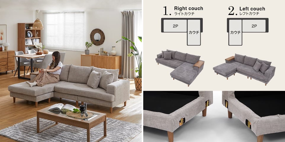 カウチは間取りや好みに合わせて、左右どちらでも設置・組換え可能。ひじ掛けに取り付け可能なサイドテーブル付きで、左右のひじ掛けどちらにも取り付けできます。撥水加工の生地だから、うっかり水をこぼしてしまっても、浸み込む前にサッと拭き取れば、後々のお手入れも簡単。5万回の耐久試験に合格した確かな品質も魅力です。
