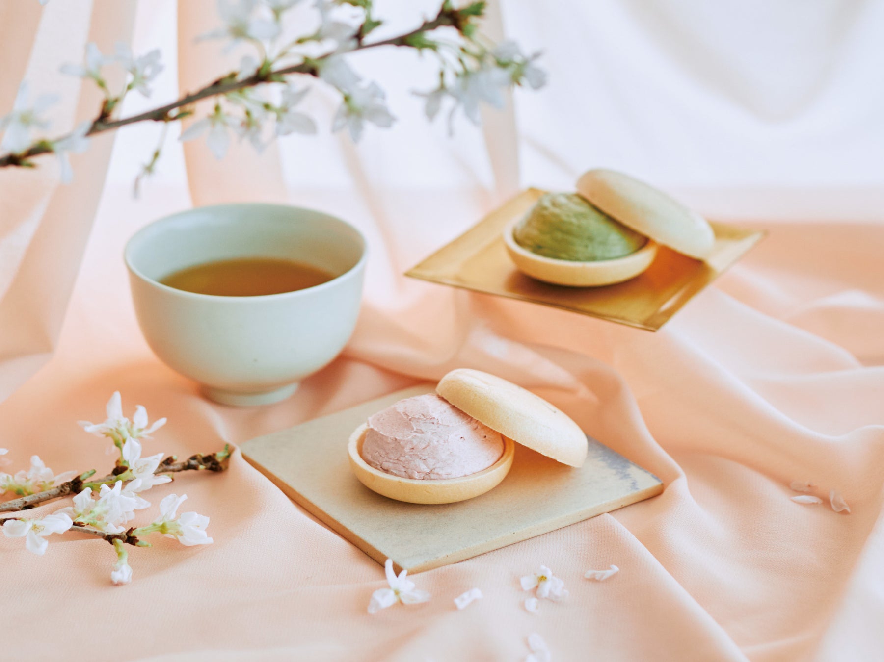 サクサクのモナカの中には、春限定の桜クリームと抹茶クリームを詰めました。桜の花びらと葉を塩漬けにし、ホワイトチョコレートと合わせた華やかな桜クリームと、福岡県奥八女、星野製茶園の厳選した抹茶を合わせた抹茶クリームの2種入りです。