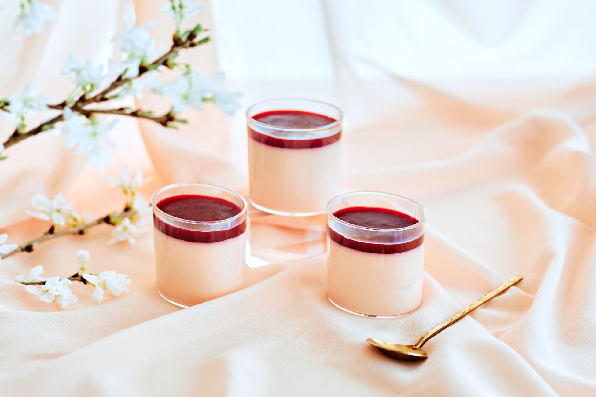 桜の華やかな香りを主役にした生チョコプリン。甘さ控えめのホワイトチョコレートと桜を合わせたプリンの上に、甘酸っぱいベリーのソースを添えました。