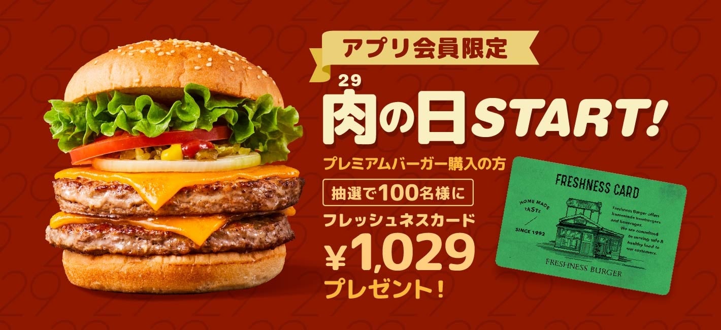少しでも多くの方に、プレミアムバーガーの魅力を知って頂きたい思いから、2と9が付く日を「肉の日」とし、イベントをスタート。公式アプリよりプレミアムバーガーの「肉の日」クーポンを使ってご購入頂いた方の中から、抽選でフレッシュネスカード1,029円分が当たります。