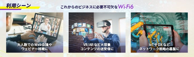この度のWi-Fi6モデルのリリースにより、「無線通信の高速化」、「多数デバイスの同時接続効率」が著しく向上。オフィスのフリーアドレス化や多人数でのWeb会議、教育現場のICT化、IoTやビッグデータの活用など、同時に大容量のデータのやりとりが必須となる、これからのビジネスシーンに不可欠なネットワークサービスです。