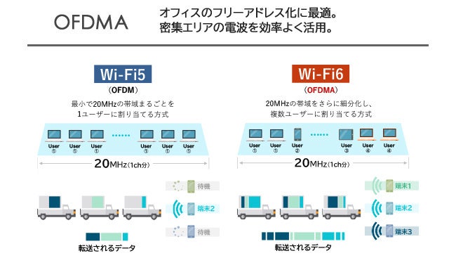 「OFDMA(直交周波数分割多元接続)」は通信帯域を分割して管理することで電波をより効率的に活用する技術です。小さいデータを送る際、これまで無駄になっていた部分に他の端末のデータを割り当てられるようになったため、同時通信時の時間あたりの通信効率が大きく向上しました。