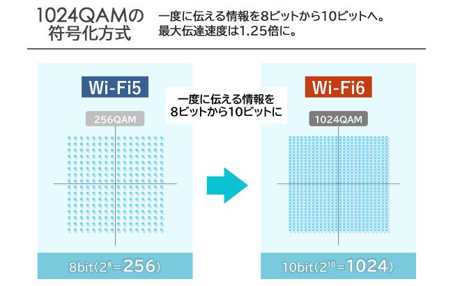 Wi-Fi5では256QAMまでだった符号化方式を、Wi-Fi6では1024QAMまで追加。これにより一度に伝えられる情報が8ビットから10ビットへ増え、最大伝達速度は1.25倍まで上昇しました。
