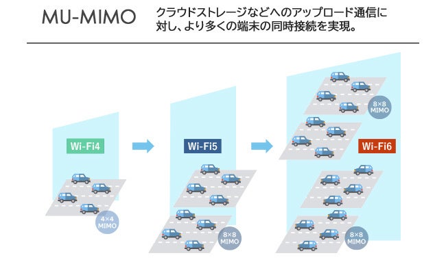 MU-MIMO (Multi User Multiple Input Multiple Output) は、複数の端末に同時にデータを送受信する技術です。Wi-Fi5ではダウンロード方向のみだったのに対し、Wi-Fi6ではアップロード方向でも利用可能に。これにより、クラウドストレージなどアップロードが多いアプリの通信がより快適になりました。