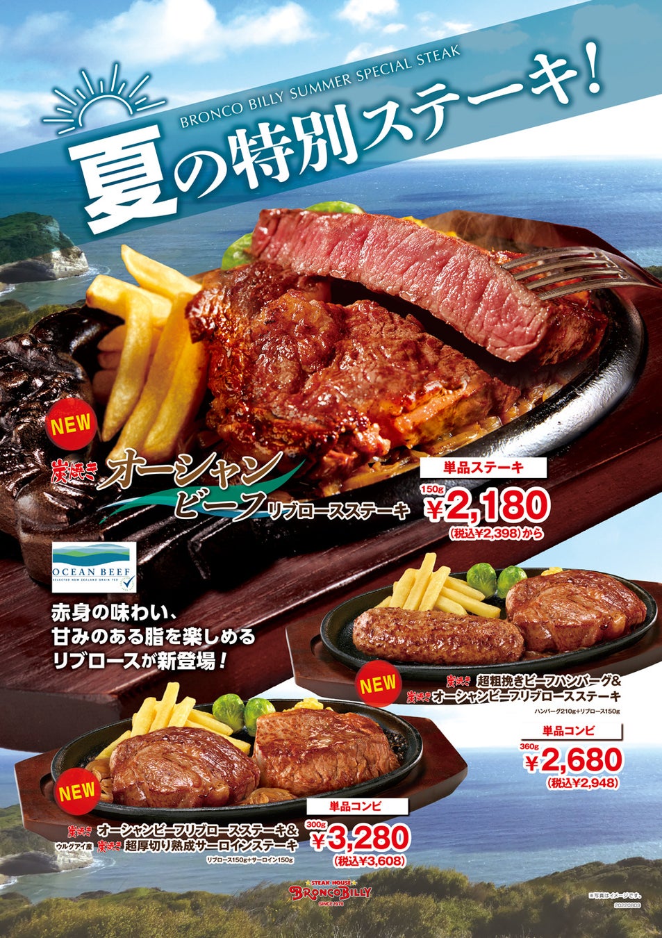 この度、まるで食のテーマパークのようなブロンコビリーで、美味しく楽しい夏の思い出を増やしていただこうと、8月9日(火)より『炭焼きオーシャンビーフリブロースステーキ』の販売を開始します。