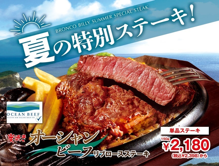 株式会社ブロンコビリー(本社:愛知県名古屋市 代表取締役社長:竹市 克弘)は、8月9日(火)よりニュージーランド産『炭焼きオーシャンビーフリブロースステーキ』を、全131店にて提供を開始いたします。全店オープンキッチンのブロンコビリーは、お肉を焼く様子や、野菜をカット・調理する様子、大かまどでごはんを炊き上げる様子など、目で・耳で・香りで楽しめる、食のテーマパークです。是非今年の夏は、楽しく美味しい思い出を、ブロンコビリーでお作りください。URL: http://www.bronco.co.jp/