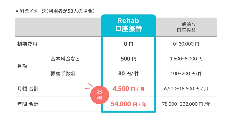 科学的介護ソフト「Rehab Cloud(リハブクラウド)」を運営する株式会社Rehab for JAPAN(本社:東京都千代田区、代表取締役 大久保 亮 以下「当社」)は、口座振替サービス「Rehab口座振替」の提供を開始いたしました。