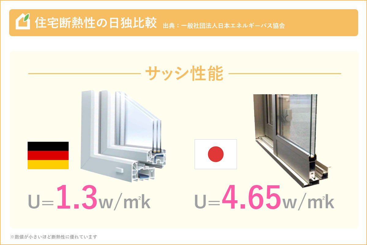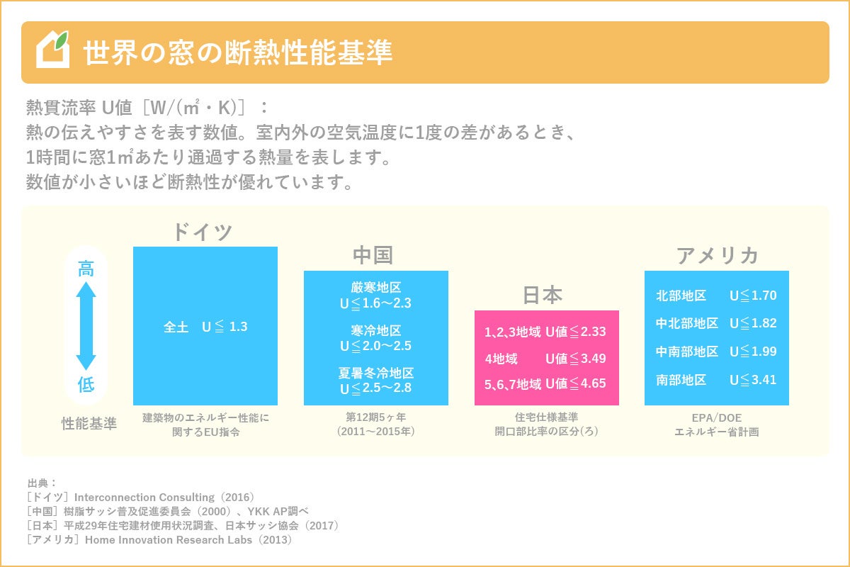 熱の伝えやすさを表す数値、熱貫流率 U値は数値が小さいほど断熱性が優れています。数値を比べるとドイツ全土がU=1.3W/㎡Kに対し、日本ではU=4.65W/㎡K(概ね仙台以南の地域)と大きな差が。地域ごとに違いはあるものの、日本で広く採用されているサッシの性能の低さがうかがえます。