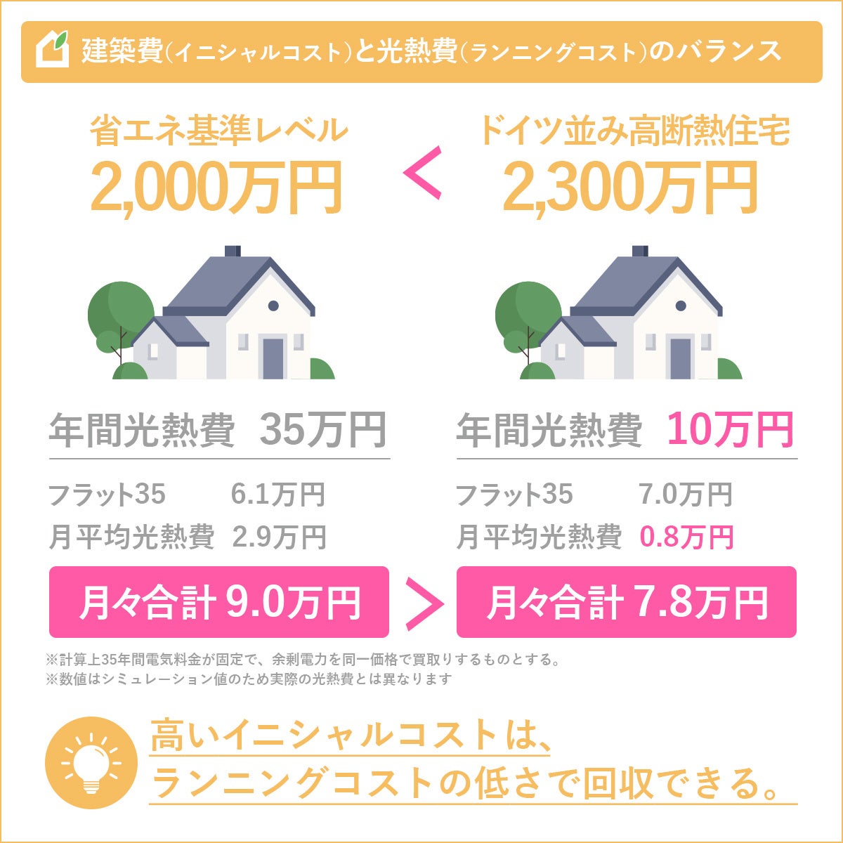 高気密・高断熱住宅は建築費が高いことが課題ですが、実は高性能化に伴う月々の住宅ローン返済額増よりも、冷暖房光熱費の削減額の方が大きくなります。ほとんどのケースで、初年度から経済的に得になるのです。ローン完済後は、光熱費の削減メリットがまるまる懐に残り老後の生活のゆとりにつながります。光熱費は、今後さらに値上がりが続く見通しのため、高性能化の経済的な優位性はさらに増していくものと思われます。
