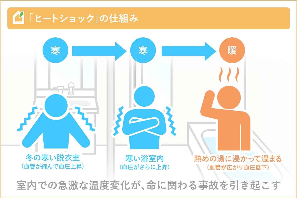 家の中の室温差が居住者の心臓や脳に負担を与える「ヒートショック」。特に冬の寒い脱衣室・浴室は注意が必要です。2017年1月25日付、消費者庁の推計によると、「ヒートショック」等により亡くなっている方は、約19,000人/年と推定されています。一方、2022年1月4日付の警視庁資料によると2021年の全国の交通事故死者数は2,636人。ヒートショックによる年間の死者数は交通事故死者数の約7.2倍に上ります。さらに、命を取りとめても、半身不随等の後遺症を残して健康寿命を縮めている方も多く、増大する社会保障費負担の一因にもなっています。