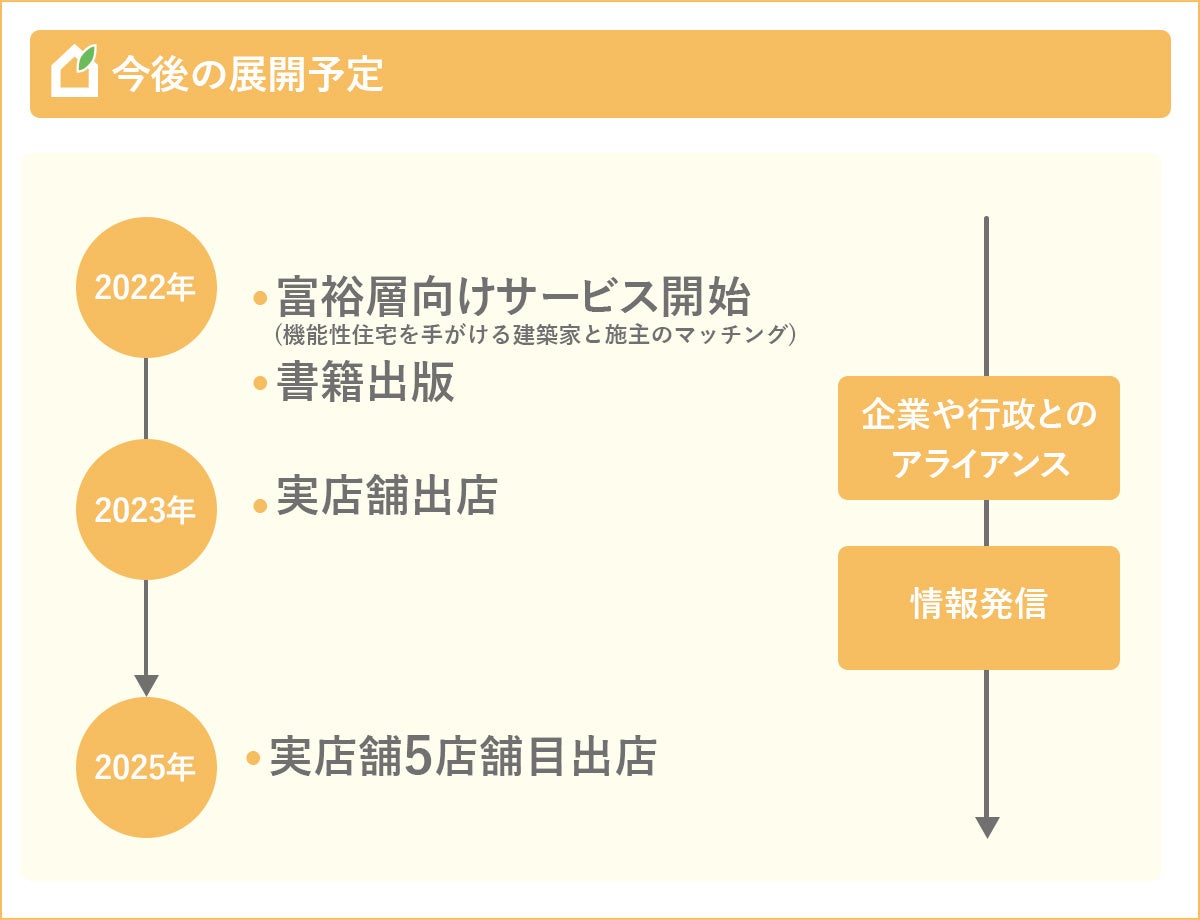 住まいるサポート社が目指しているのは、日本の新築の過半数が十分な性能の高気密・高断熱になり、高気密・高断熱住宅が当たり前の社会にすること。概ね10年以内にはそれを達成する計画です。今後は脱炭素社会に向けて、住宅事業を取り巻く事業環境も劇的に変化していくものと考えられますが、新たなビジネスチャンスを取り逃がさず、IPOまたはバイアウト(M&A)によるEXITを想定しています。