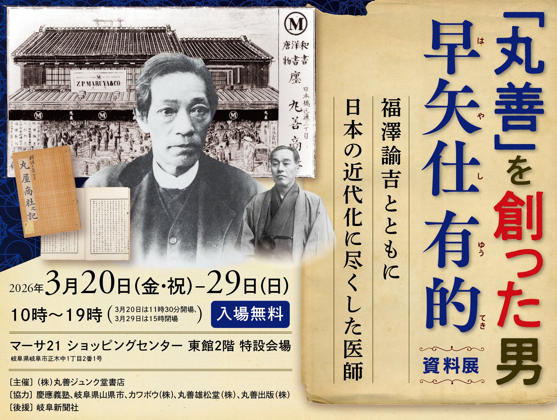 株式会社丸善ジュンク堂書店(本社:東京都中央区)は、丸善の創業者である早矢仕有的(はやし・ゆうてき、1837-1901)の没後125周年に際し、2026年3月20日(金)~3月29日(日)の期間、岐阜市の商業施設「マーサ21 ショッピングセンター」東館2階特設会場にて『「丸善」を創った男早矢仕有的資料展』を開催します。
