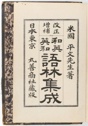 1887年に丸善が出版した英語で書かれた日本語辞典。初版、第二版は上海の出版社によって印刷されたが、第二版を倍増させたこの第三版から丸善が出版した。編著者のヘボンは医師で、有的もヘボンの治療を手伝ったこともあるという。ヘボンは第三版の版権を丸善に譲渡し、出版に至った。当時の丸善は丸家銀行の破綻による再建中であったが版権買取に踏み切り、ヒット商品に繋げた。