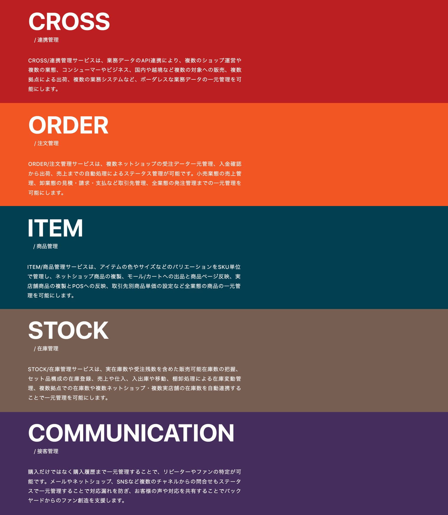 業界初、バックヤード業務のボーダレスな一元管理を実現するクラウドサービスです。「BACKYARD™」のサービスプラットフォーム上には、CROSS/連携管理、ORDER/注文管理、ITEM/商品管理、STOCK/在庫管理、COMMUNICATION/接客管理、の各サービスと機能で構成されています。