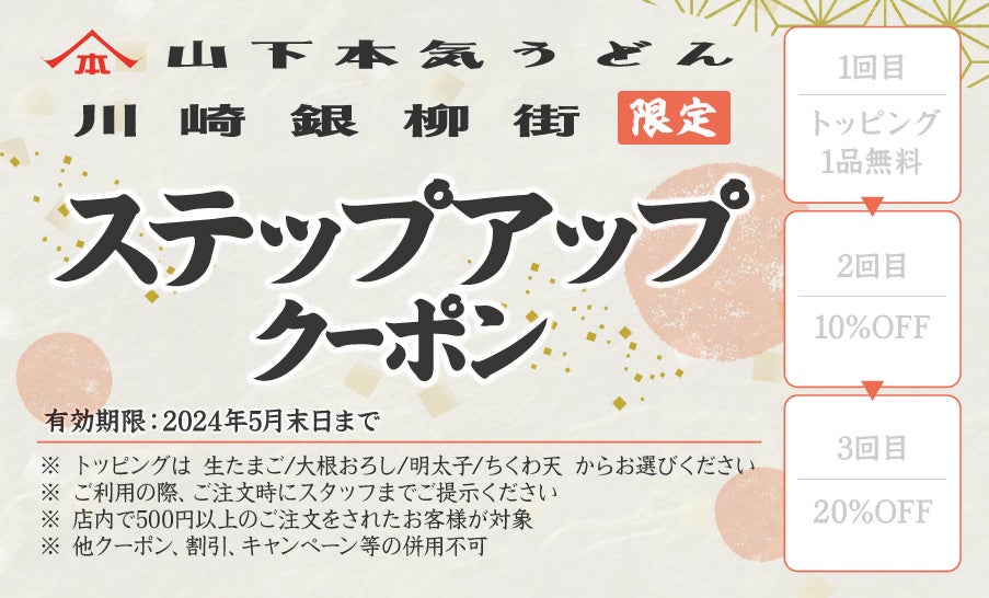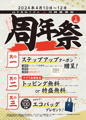 山下本気うどん 川崎銀柳街にご来店いただいたお客様を対象に、2024年4月10日(水)から4月12日(金)の3日間限定で異なる3つのキャンペーンを開催します。