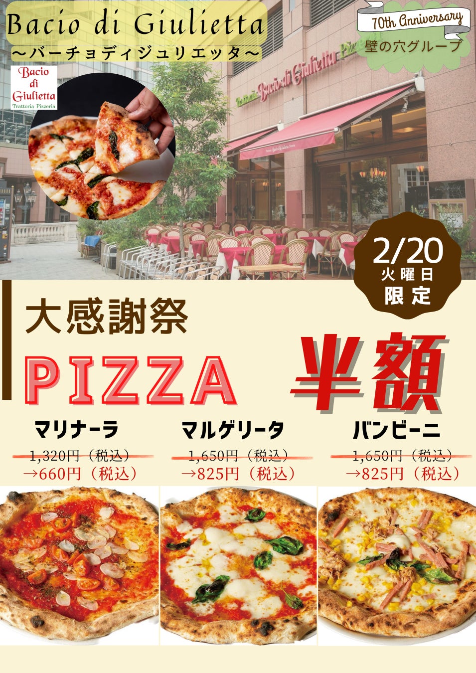 2/20(火)イタリア本場のピザ「バーチョ・ディ・ジュリエッタ恵比寿店」ピッツア3メニューが一日限りの半額!