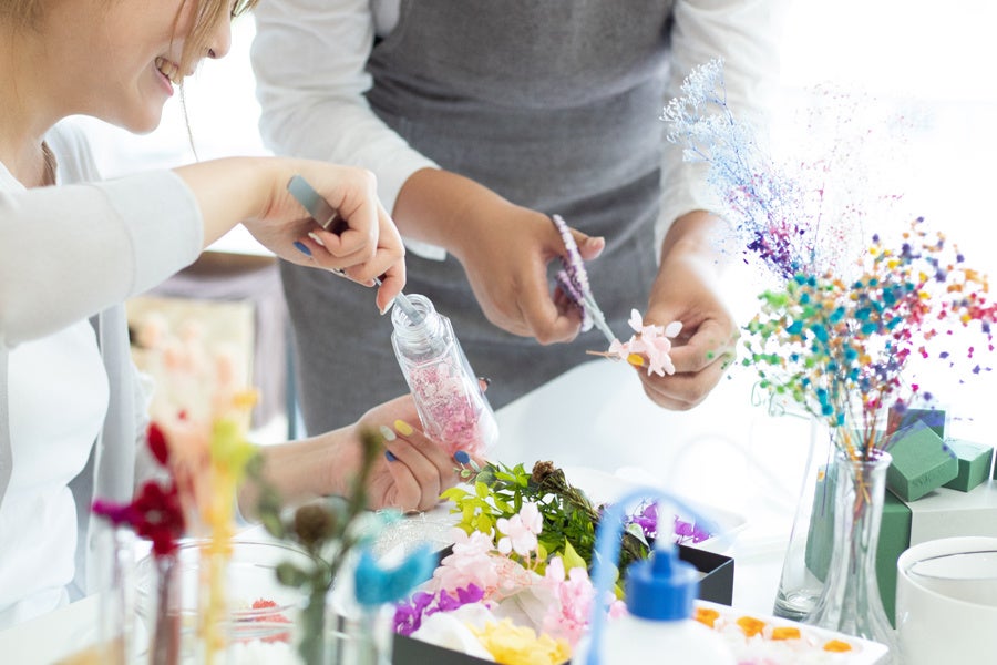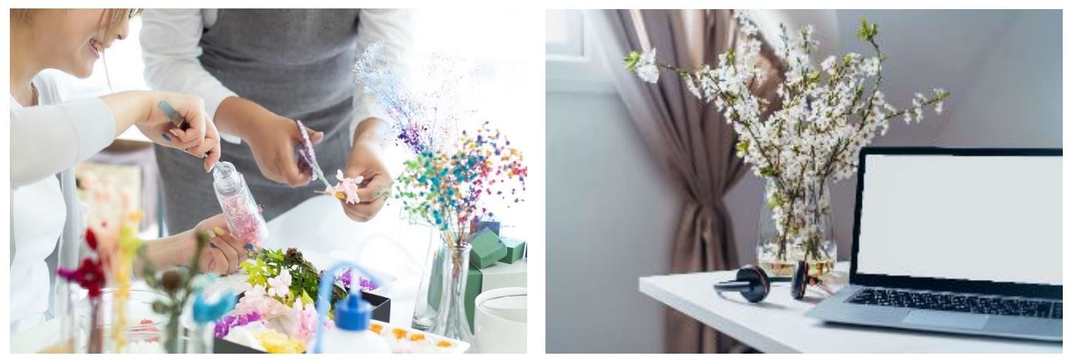 第一園芸では様々な法人向けにワークショップを展開しています。利用企業の中には、コロナ禍で出社が減ったため、福利厚生の一つとして社員の自宅に花を送り、好きな時間に動画を見ながらアレンジメントを作る取り組みを始めた企業もあります。「自宅で好きな時間に、ときには家族も一緒に、花に触れることができて楽しい」と好評です。また、別の企業では、リモート入社式を行うにあたり、事前に社員の自宅に花を届け、その花を眺めながら入社式を行うという取り組みも行われています。