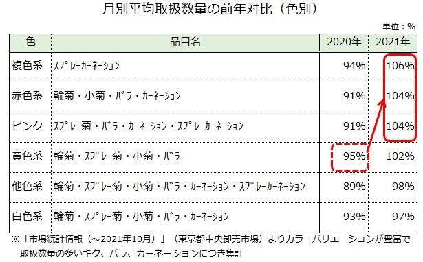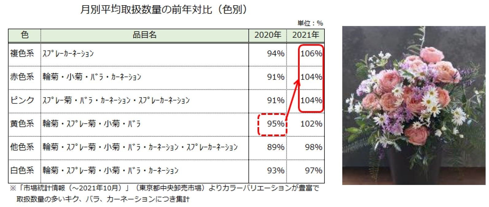 - 巣ごもり需要の黄色い花人気に変化。戻ってきた日常生活と共にニュアンスカラー・赤・ピンクが復活