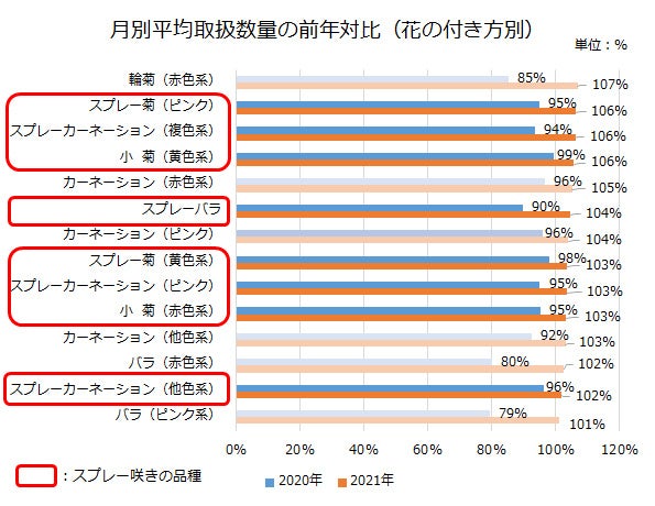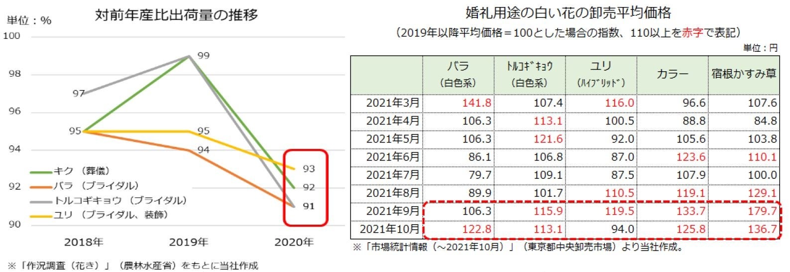 | 【本資料のポイント】 ■法人の花の活用方法が“ギフト”から“社員とのコミュニケーションツール”へ変化 ■個人用では、自家需要の増加やサブスクの登場で小型の花が求められる傾向に ■人気の花の色は黄色からニュアンスカラー・赤・ピンクに変化 ■母の日ギフトは原点回帰傾向で、カーネーション鉢の人気が復活。当社取扱実績も昨年の3倍へ ■観葉植物の需要増加で生育サイクルが合わず品薄状態。卸売平均価格も前年度比114%まで上昇 ■婚礼需要が復活し白花が品薄に ■花き関連企業や団体のSDGsへの取り組み事例 |