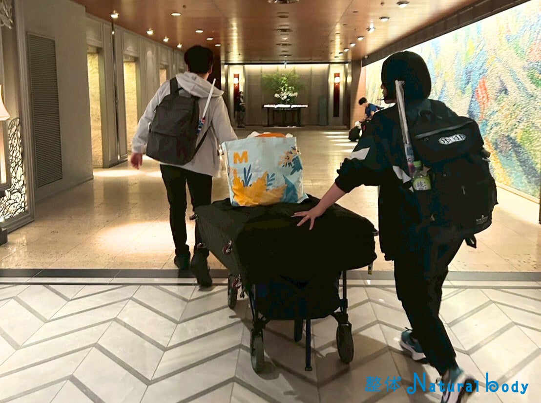 1日目は相模原ステージを見学後、選手が滞在する都内ホテルにて、専属ケアラー安見氏のもとで業務を補助。