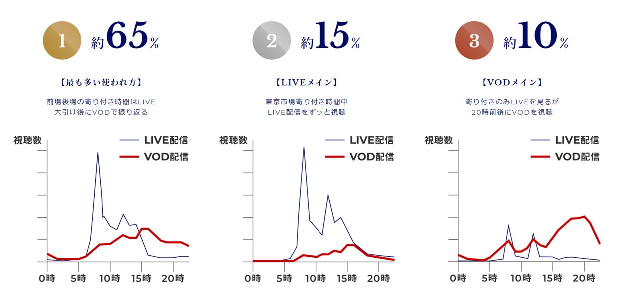 2023年12月現在、利用者のアクセスは大きく3種類に分かれており、最も多い使われ方は朝9時の「東京市場 寄り付き」と午後0時30分の「東京市場 後場寄り付き」時間帯にLIVE配信を視聴し、15時の「東京市場 大引け」以降にVOD動画を視聴するパターンとなりました。VOD動画をメインに視聴する利用方法の場合、15時以降に大きく伸びており20時頃にアクセス数はピークとなります。(調査方法:「日経CNBC online」サイトアクセス数から集計)