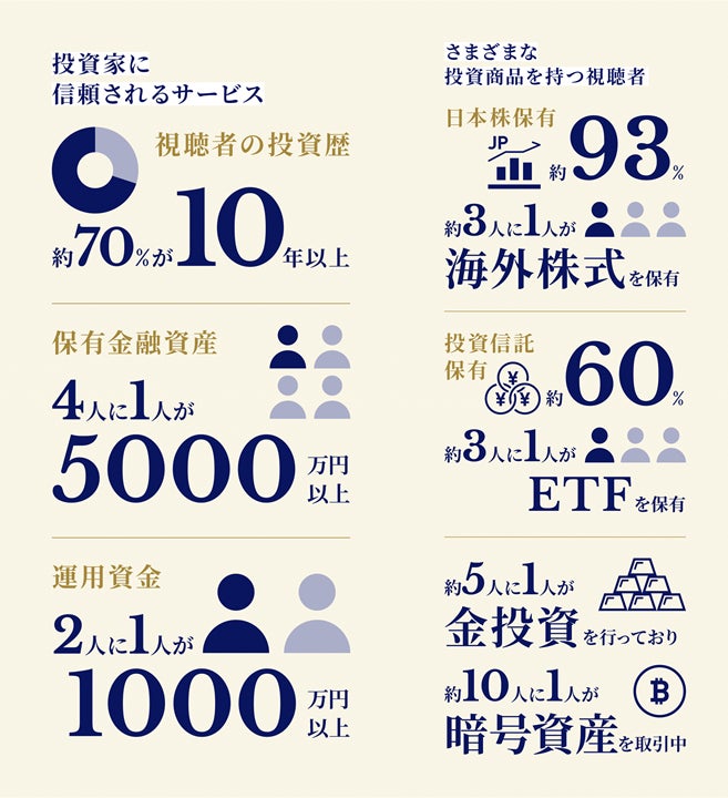 日経CNBCの視聴者が最も多く保有する金融商品は日本株となり、全回答者の約93%が保有。海外株は全体の約3割が保有しており、そのほかETFや金投資、暗号資産など幅広く投資・資産運用を行う傾向となっています。10年以上の投資歴を持つ視聴者は7割を超えており、保有する金融資産は全回答者の約4人に1人が5000万円以上、1000万円以上の運用資金を保有する回答数が半数を超えるなど、投資・資産運用のベテランや玄人が多いことが分かっています。(調査方法:日経CNBC アンケート調査による自社調べ、20代~90代の視聴者555名)