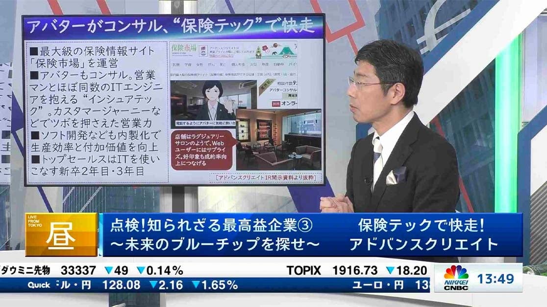「点検!知られざる最高益企業~未来のブルーチップを探せ~」は、証券アナリストなどのカバーが行き届かない「知られざる最高益企業」の中から、「未来のブルーチップ」を求めて、田中彰一解説委員が経営トップやIR責任者に直接取材し、その真の実力を探るコーナーです。総合1位のアクセス数となった23年1月19日放送回は”保険テック”アドバンスクリエイトの解説回でした。