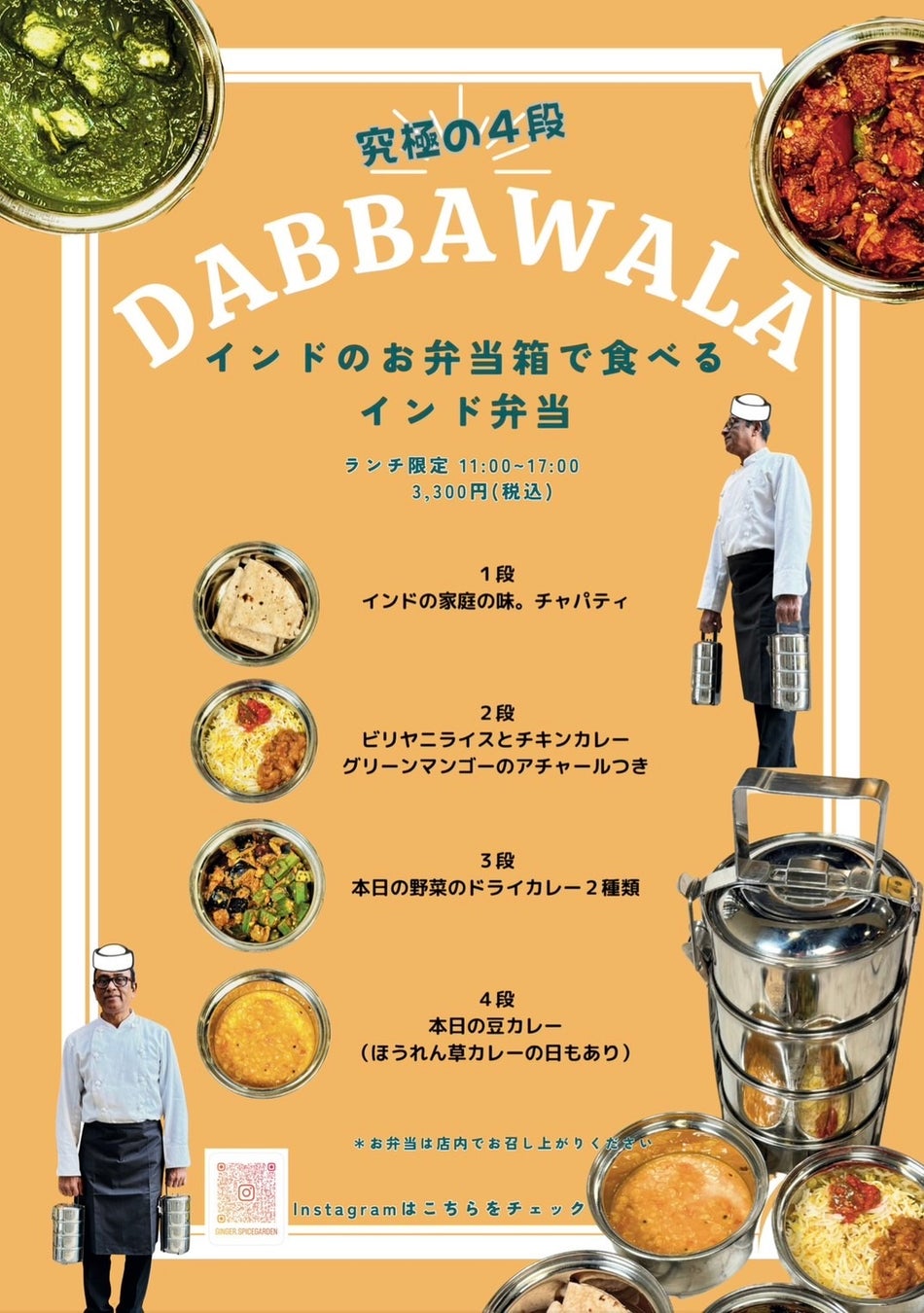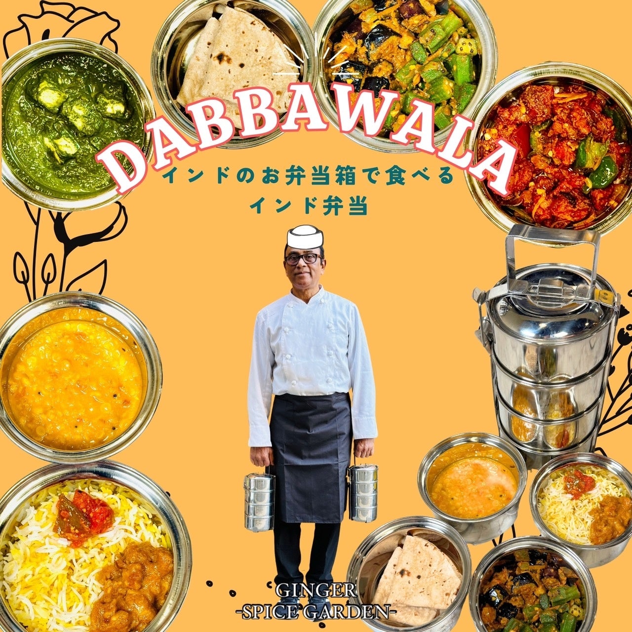 GINGERでは、伝統的な食文化であるダッバーワラを楽しめるインド弁当をランチタイム(11:00~17:00)限定でご提供いたします。インドのステンレス製の4段の弁当箱「ダッバー」に、ビリヤニや旬の野菜のドライカレーなど、プロが作った自慢の料理を入れて、店舗のスタッフが目の前にお持ちします。店内で、ダッバーワラというインドの食文化体験を気軽に楽しめる新しい体験型のメニューサービスです。