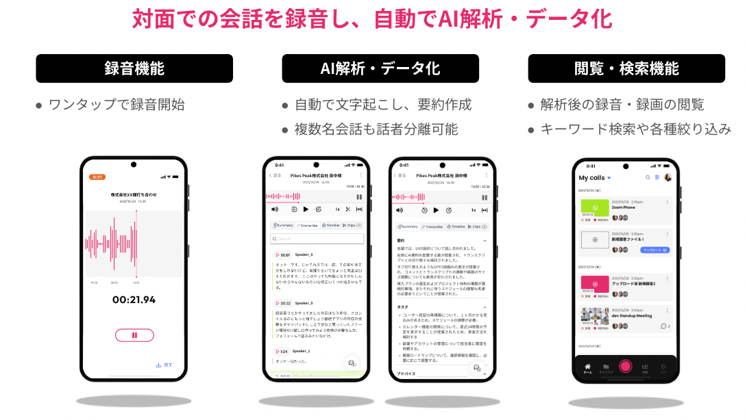 JamRollは、会話を見える化し営業生産性を向上させる商談支援AI SaaSです。オンラインと対面のハイブリットな営業活動が定着し、JamRollをご利用いただく企業は拡大しています。一方、対面での商談や打合せのシーンでも、録音・文字起こしのデータを活用し、営業スキルの向上と情報共有を自動化したいといったニーズにお応えし、「JamRoll Mobile」のリリースに至りました。JamRoll Mobileの活用により、議事録作成から解放され、正確な一次情報でコミュニケーションの齟齬をなくし、対面による商談や打合せに集中できる環境をご提供します。