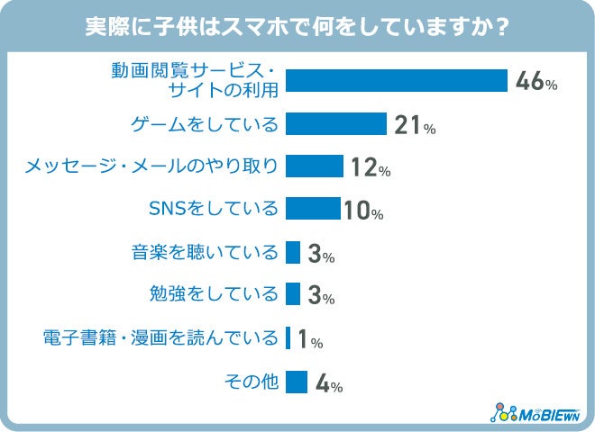 「実際に子供はスマホで何をしていますか?」という質問においては「動画閲覧サービス・サイトの利用」にスマホを使用しているとの回答が最も多く、46%でした。