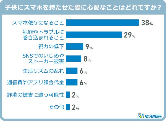 「子供にスマホを持たせた際に心配なことはどれですか?」という質問に対する回答として、38%の方が「スマホ依存になること」、29%の方が「犯罪やトラブルに巻き込まれること」が心配と答えられました。