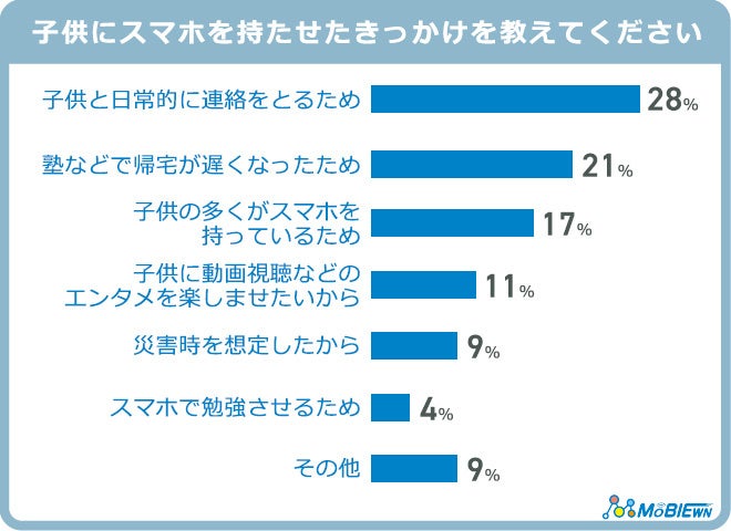 「子供にスマホを持たせたきっかけは」という質問では、28%の方が「日常的に子供と連絡を取るため」にスマホを持たせていると回答しました。